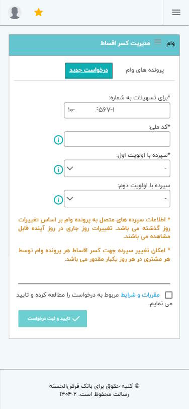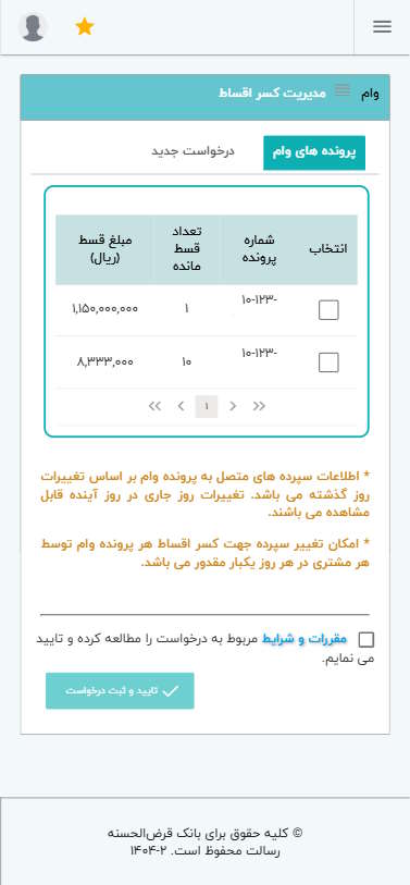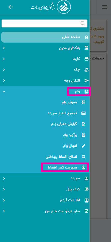 جهت درخواست تغییر سپرده جهت کسر اقساط، ابتدا در منوی اصلی، گزینه وام و سپس گزینه مدیریت کسر اقساط را انتخاب کنید.