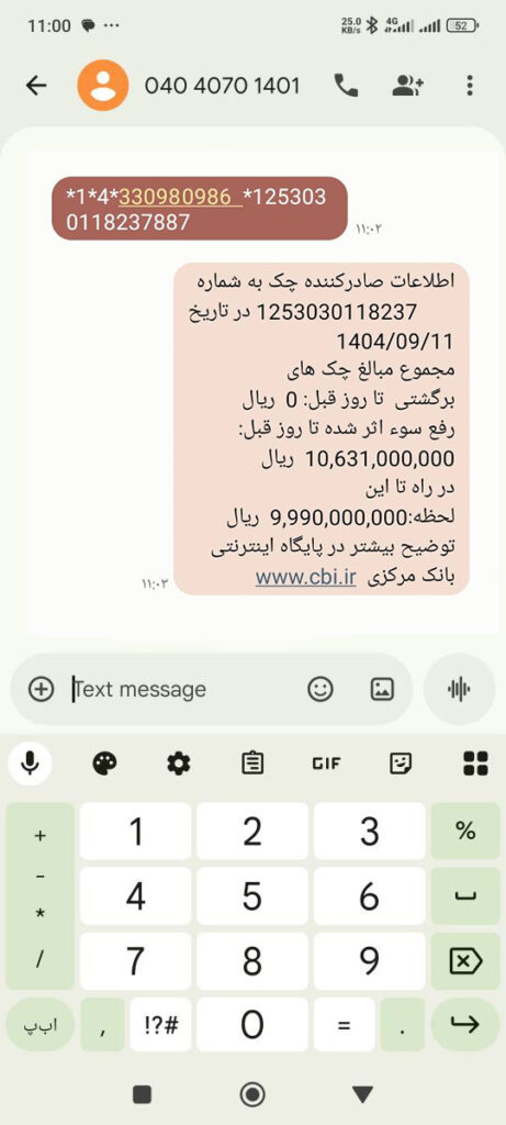 نکته: دقت داشته باشید شما باید با خطی که به نام شما و مالک کد ملی است پیام بفرستید. همچنین چک باید در وجه شما صادر و ثبت شده باشد.