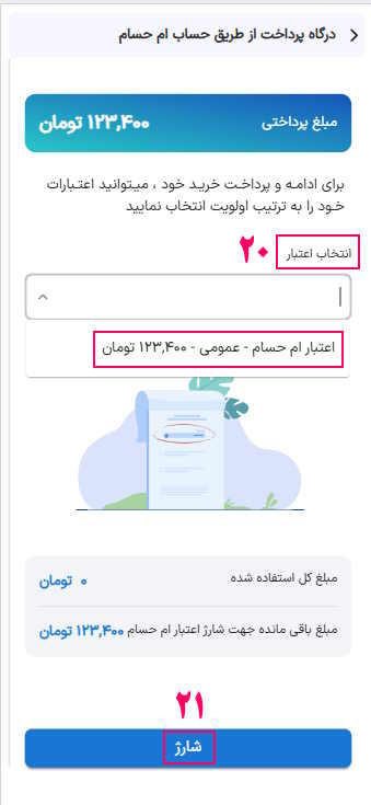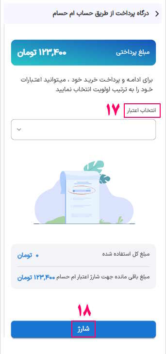 17- برای پرداخت، گزینه انتخاب اعتبار را انتخاب کنید؛ اگر اعتبار مورد نظر را نداشتید، از طریق گزینه شارژ، اقدام به شارژ ام حسام خود نمایید.