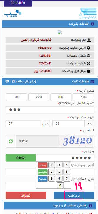 19- در این صفحه با وارد کردن اطلاعات کارت بانکی خود و دریافت رمز دوم، مبلغ مورد نیاز شارژ را انتخاب نمایید.
