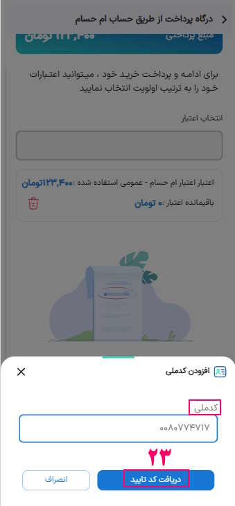 23- جهت تایید پرداخت، کد ملی خود را وارد کرده و گزینه دریافت کد تایید را ثبت نمایید.