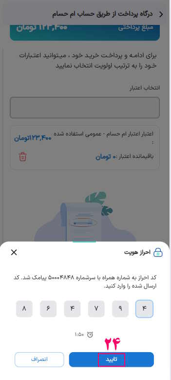 24- کد پیامک شده را وارد و گزینه تایید را کلیک نمایید.
