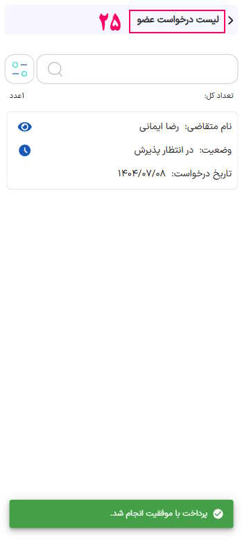 25- در انتها به صفحه لیست درخواست عضو هدایت میشوید و در پایین صفحه، گزینه پرداخت با موفقیت انجام شد را مشاهده میکنید.