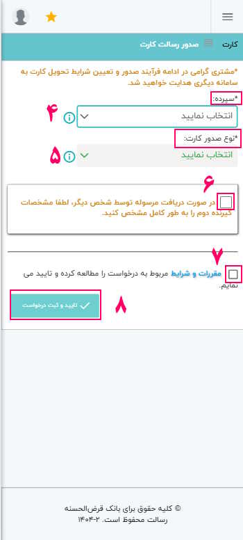 5- نوع صدور کارت را مشخص کنید: درخواست کارت با شماره قبلی و یا درخواست کارت با شماره جدید.