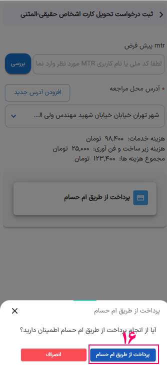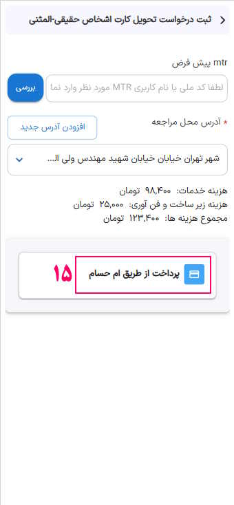 15- هزینه خدمات و زیرساخت که مجموعا 123/400 تومان میباشد را با کلیک روی گزینه پرداخت، از طریق ام حسام پرداخت کنید.