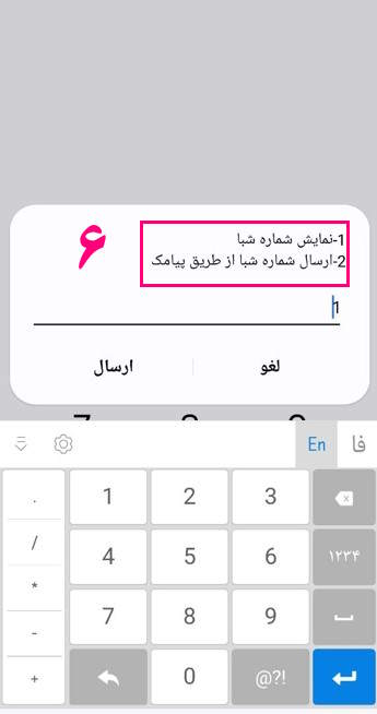 6- با وارد کردن عدد 1 نمایش شماره شبا و یا عدد 2 ارسال شماره شبا از طریق پیامک گزینه ارسال را بزنید.