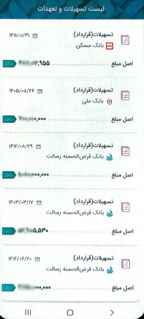 در این صفحه میتوانید لیست تمام تسهیلاتی را که دریافت کردهاید (همراه با مانده بدهی آن) مشاهده کنید.