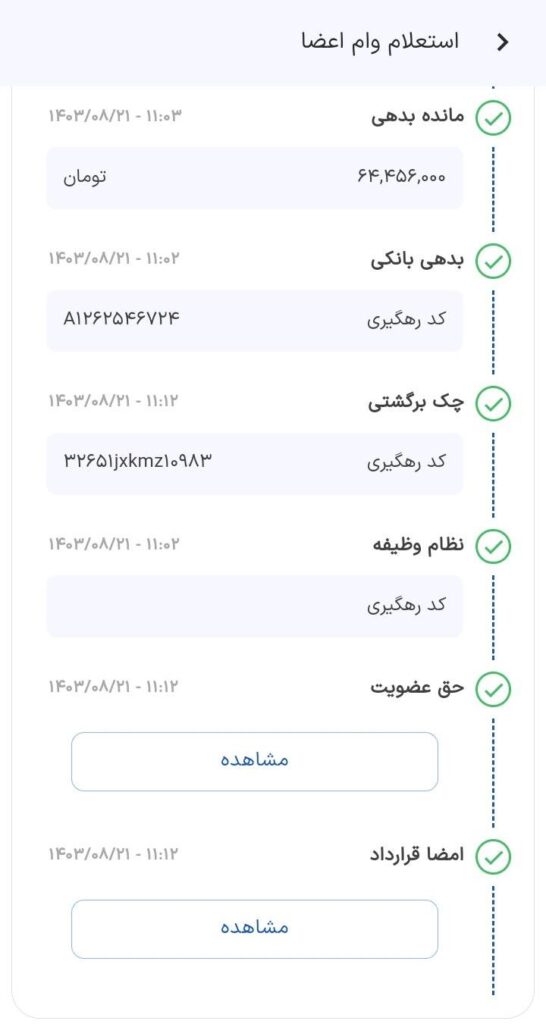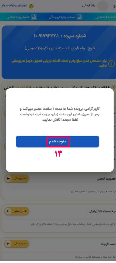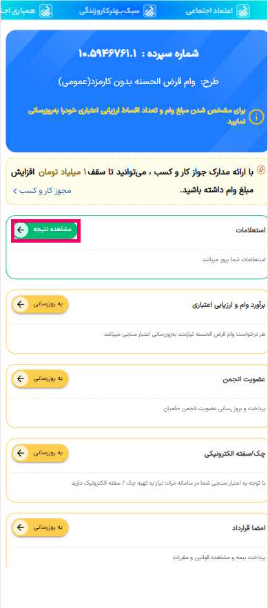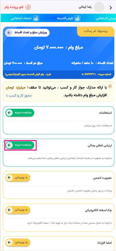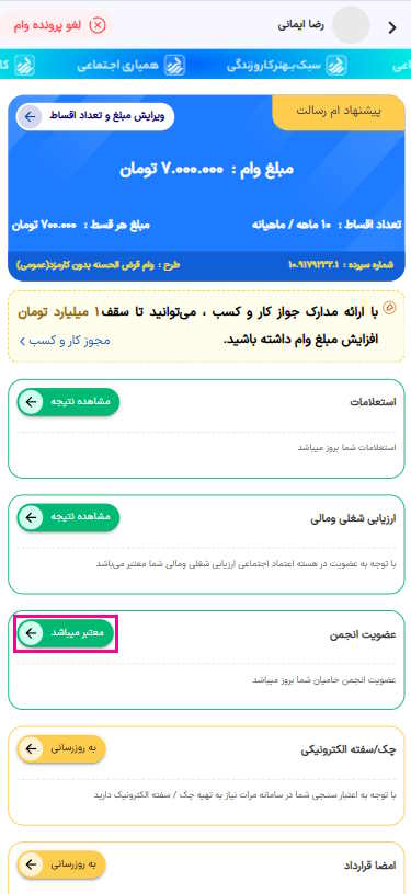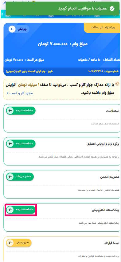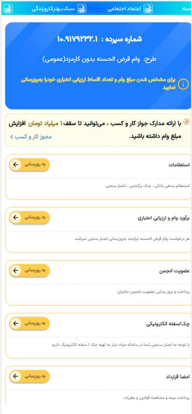 در این بخش شروع کنید به انجام به روزرسانی کاشی های استعلامات، برآورد وام و ارزیابی اعتباری، عضویت انجمن، چک/سفته الکترونیکی و امضا قرارداد بعد از سبز شدن همه کاشی ها وام شما در مرحله آماده واریز قرار می گیرد.