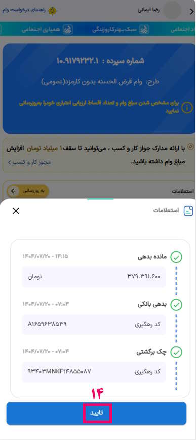 14- با انتخاب گزینه به روزرسانی استعلامات سامانه مانده بدهی، بدهی بانکی و چک برگشتی شما را بررسی میکند در صورتی که در این مرحله مشکلی نداشته باشید گزینههای سبز برای هرکدام از استعلامات روشن میشود و با انتخاب گزینه تایید به مرحله بعد میروید.