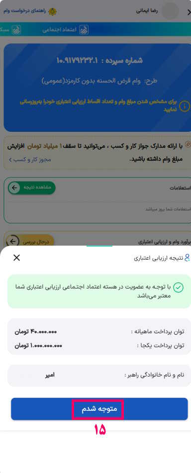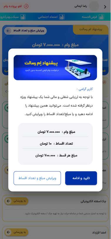 بعد از سبز شدن گزینه برآورد وام و ارزیابی اعتباری سامانه پیشنهاد ام رسالت را به شما نمایش میدهد درصورت درست بودن مبلغ ، تعداد اقساط و مبلغ هر قسط گزینه تایید و ادامه را تایید بفرمایید.
