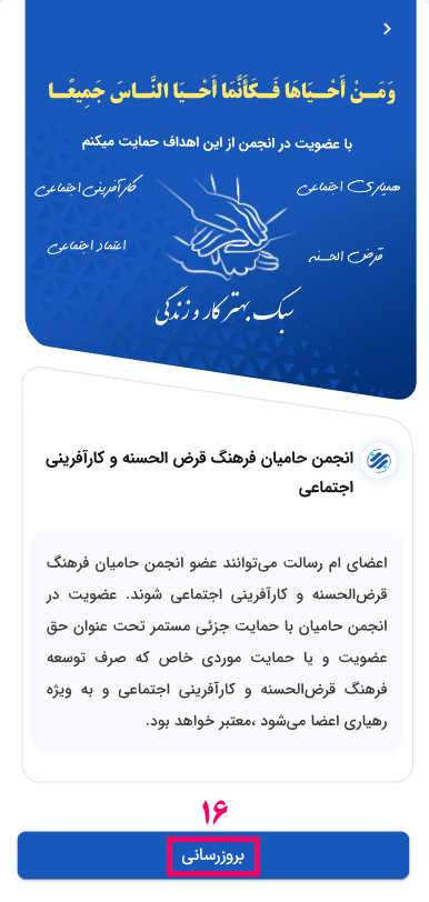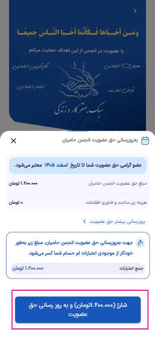 16- در این بخش باید اقدام به بروزرسانی حق عضویت انجمن حامیان فرهنگ قرض الحسنه و کارآفرینی اجتماعی کنید و هزینه مربوط به حق عضویت را از کارت بانکی خود پرداخت کنید. (هر کارت بانکی که دارای رمز دوم باشد قابل استفاده است) با تایید گزینه شارژ شما به درگاه پرداخت هدایت میشوید و هزینه عضویت بعد از وارد کردن اطلاعات کارت بانکی پرداخت میشود.
