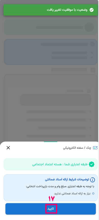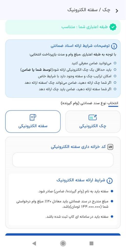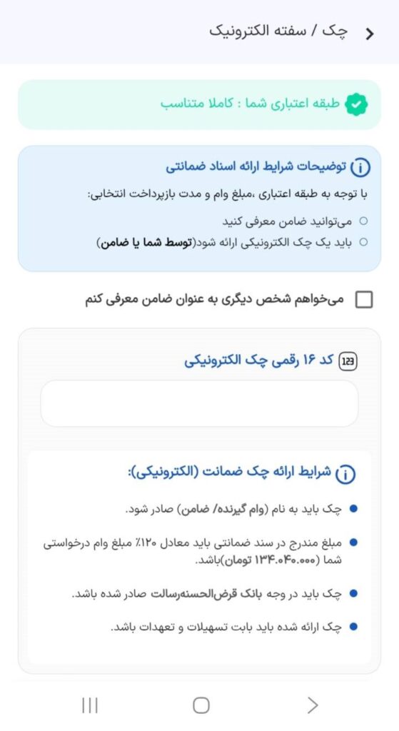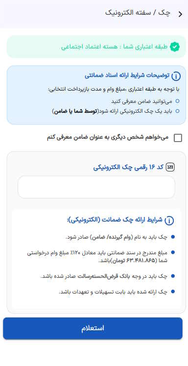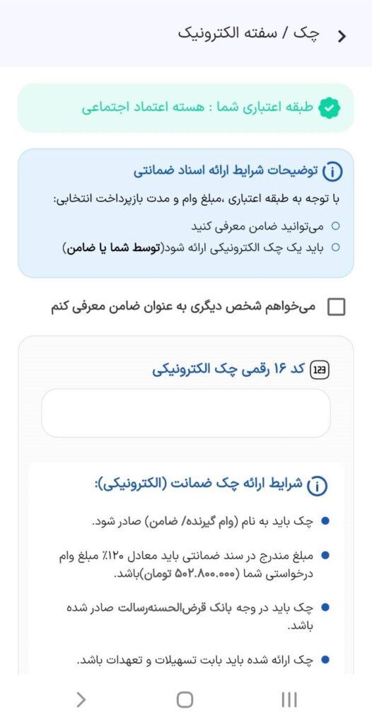 17- در این بخش با توجه به وضعیت اعتباری در مرآت و یا عضو هسته اعتماد اجتماعی بودن اگر برای دریافت وام نیاز به ضمانت چک الکترونیکی باشد سامانه از شما میخواهد خودتان و یا ضامن شما یک برگه چک الکترونیک صادر کند و بعد از وارد کردن اطلاعات چک میتوانید به مرحله آخر بروید.