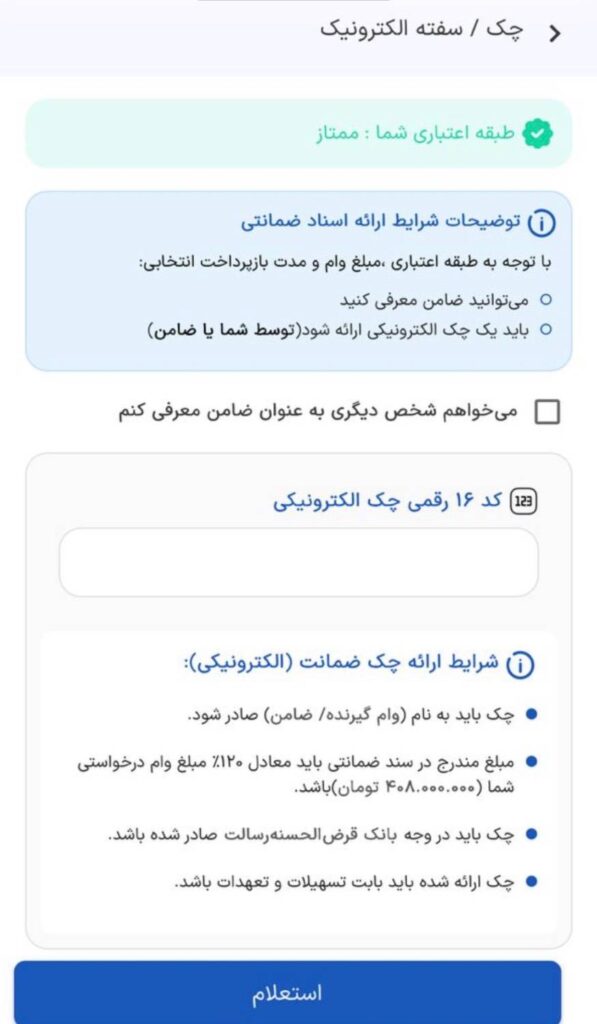 برای وارد کردن اطلاعات کد 16 رقمی چک الکترونیکی را در کادر مشخص شده وارد کنید و اگر چک را ضامن شما صادر کرده است به همراه کد ملی ضامن وارد کنید و گزینه استعلام را بزنید.