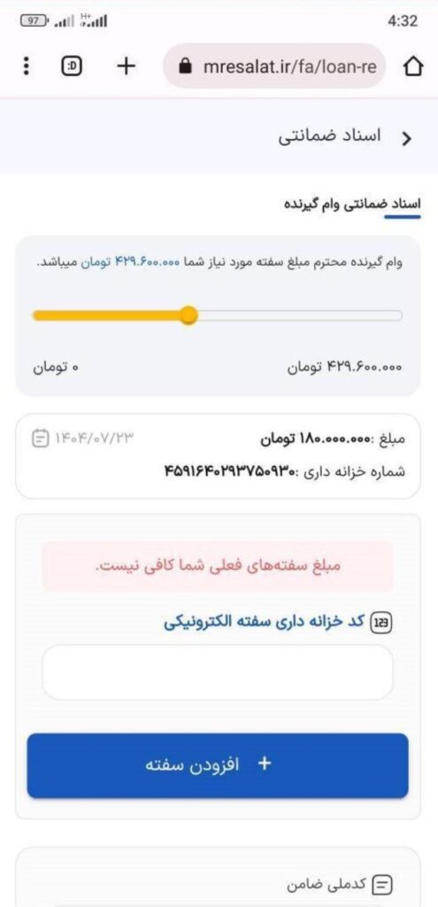 دقت داشته باشید این بخش ارتباطی به سفته و ضمانت اصلی شما برای وام دریافتی ندارد و برای وقتی است که قصد گرفتن وام بیشتر از سقف تعیین شده در سامانه مرآت دارید . فرض کنید در سامانه مرآت شما امکان دریافت یکصد میلیون تومان وام دارید اما قصد دارید 150 میلیون وام دریافت کنید، در این شرایط میتوانید با استفاده از این بخش و با افزایش اسناد ضمانتی سقف بدهی خود را افزایش دهید.