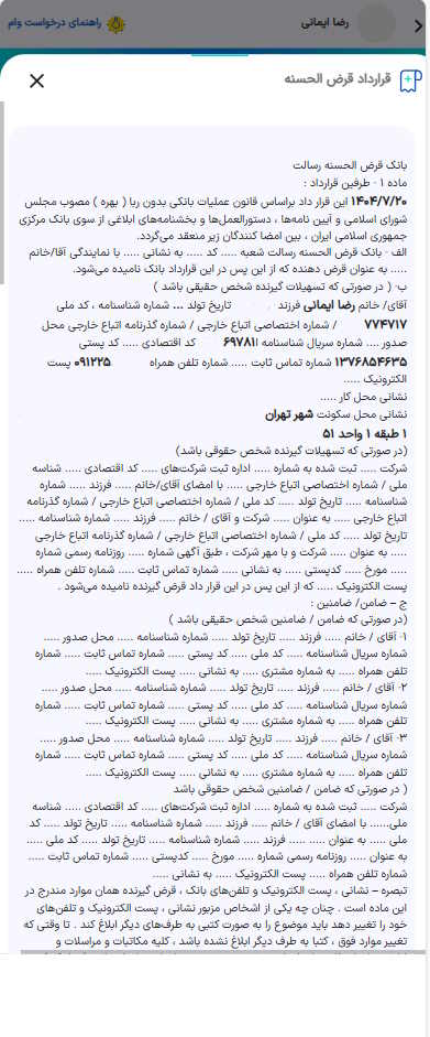 دقت بفرمایید بعد از این مرحله اگر درخواست خود را کامل نکنید و امضای قرارداد را انجام نداده باشید درخواست شما حذف خواهد شد و باید مجدد اقدام به ثبت درخواست وام قرض الحسنه بدون کارمزد کنید.