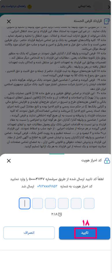 18- بعد از مطالعه قوانین و وارد کردن کد احراز هویت قرارداد شما امضا میشود.