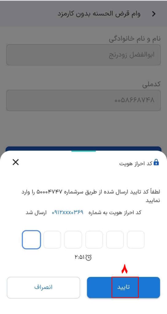 8- کد شش رقمی پیامک شده را وارد کرده و سپس گزینه تایید را بزنید.