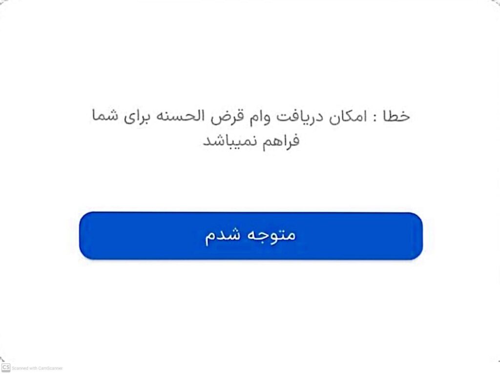 در صورتی که در بدو ورود، با این خطا مواجه شدید، دلایل آن میتواند یکی از دو مورد زیر باشد: حساب سپرده شما در بانک قرضالحسنه رسالت، اعتبار یا کارکردی ندارد و یا سقف ظرفیت بدهی شما (که در اعتبارسنجی مرآت قابل مشاهده است) تکمیل شده و امکان دریافت وام جدید را ندارید.